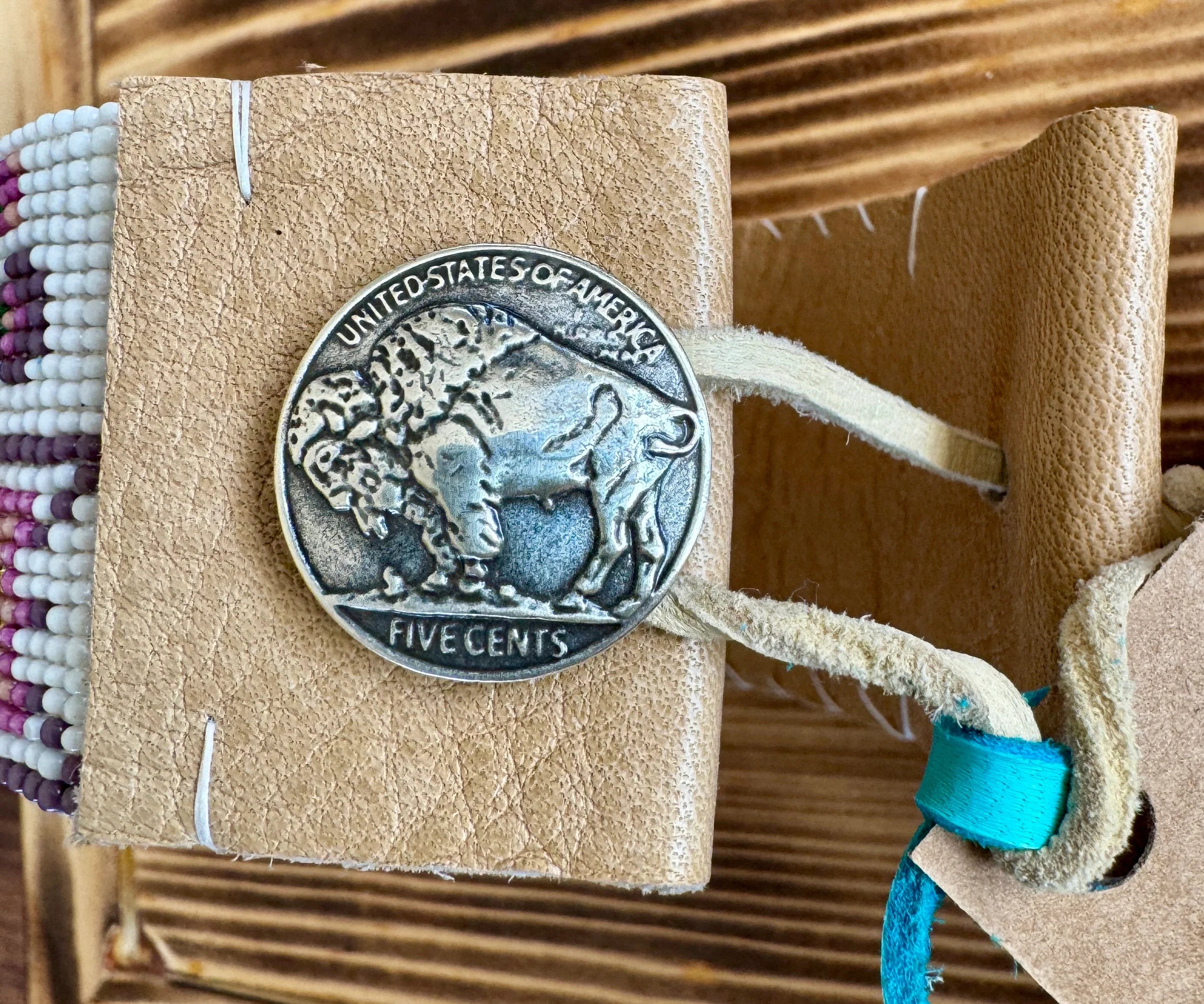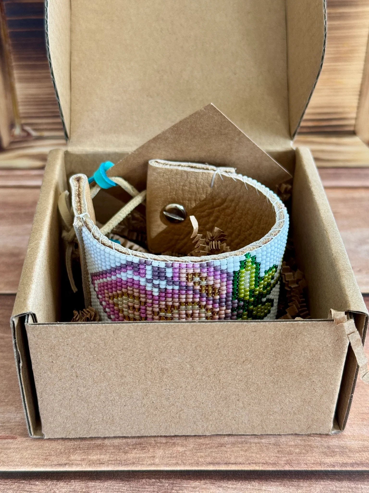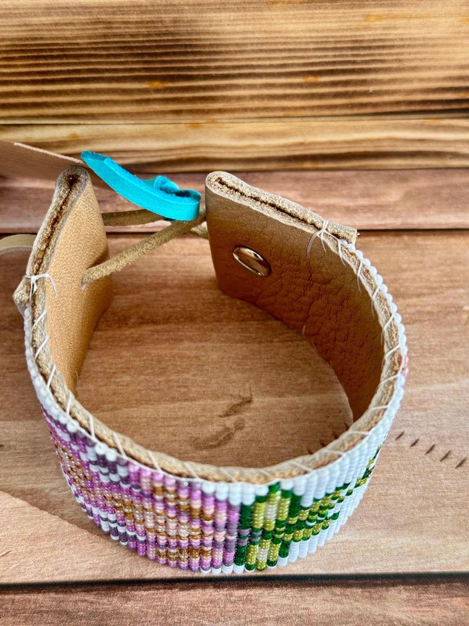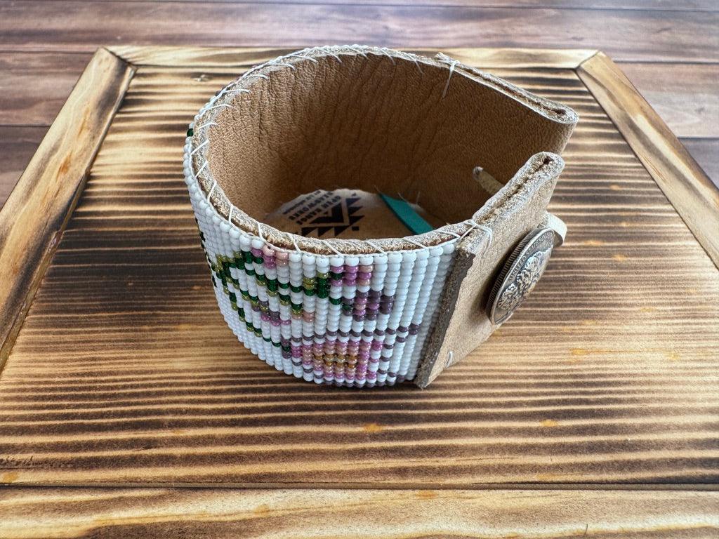 Process: Liz begins by drawing up her designs & putting together the perfect colors. She then beads the design using a loom. The loom beaded piece is glued to the leather strip that is cut out to perfectly for the beading. Once the glue is dry, she hand stitches the bead piece to the leather, & folds over the leather ends, finalizing by gluing then stitching the ends. The final step is to attach the Chicago screw button & the leather loop on either ends.