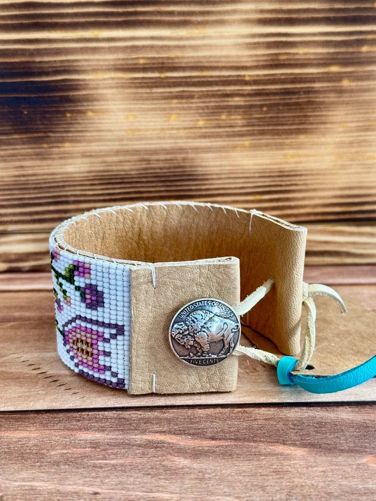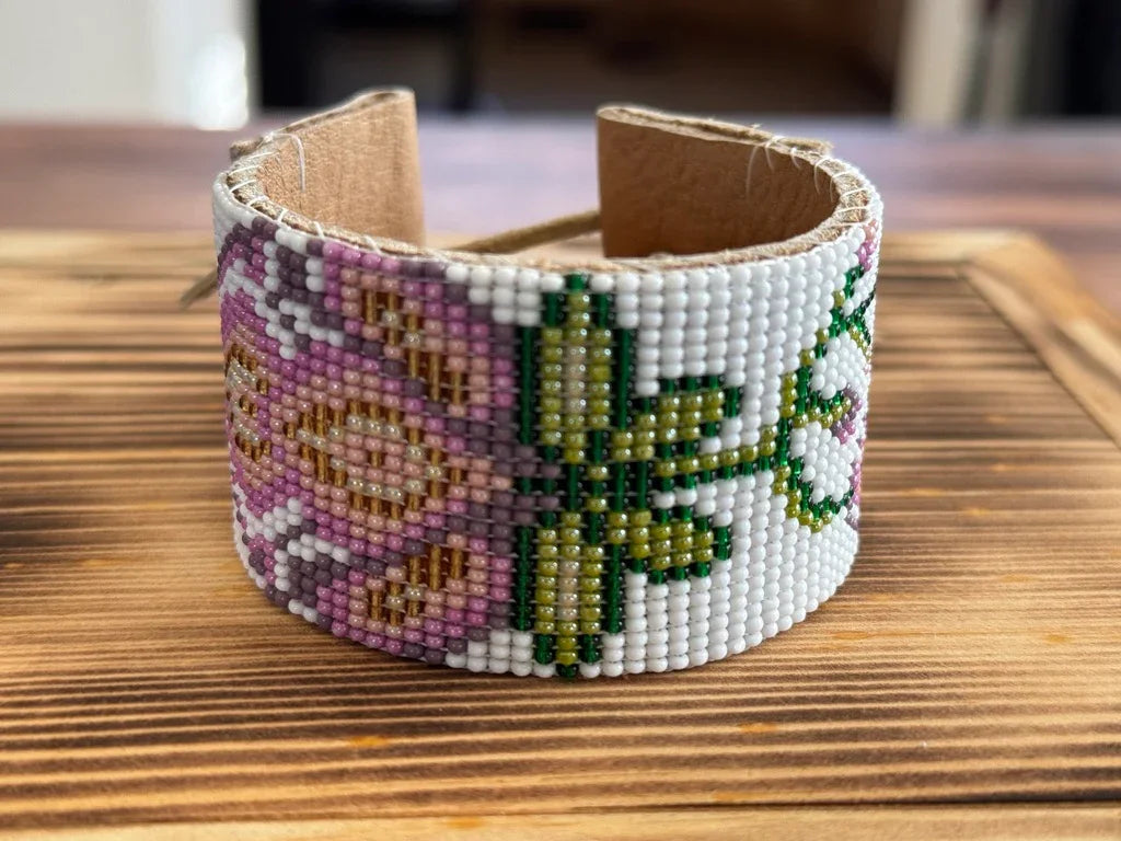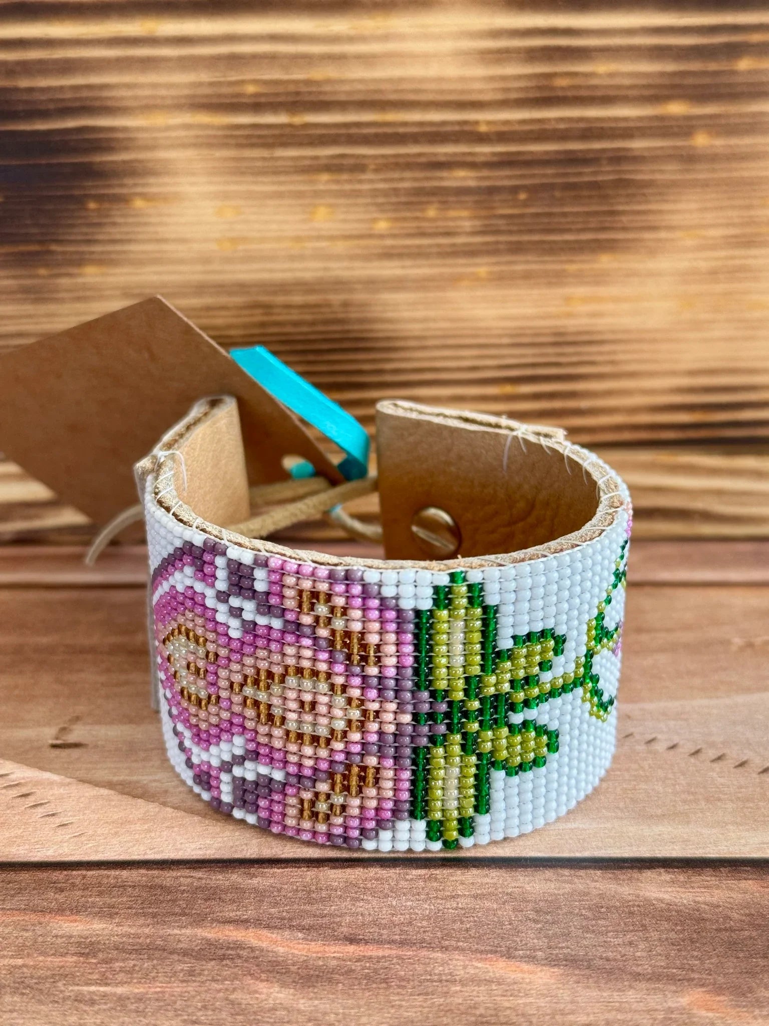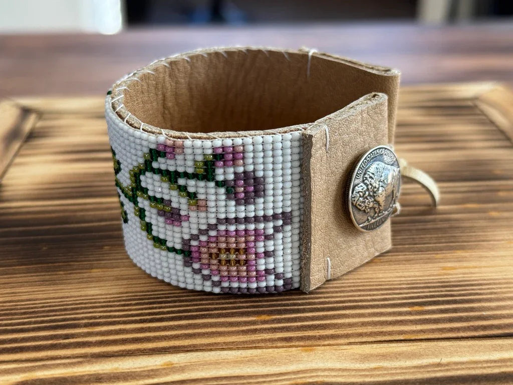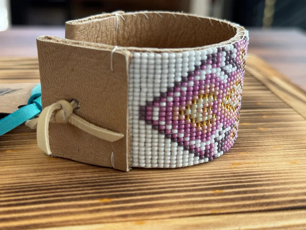 Add a pop of color to your wrist with this handmade Lavender Tulips on Tan Leather Beaded Bracelet. This hand loom crafted bracelet features a delicate lavender tulip design, making it the perfect accessory for any outfit. Handmade in the USA, this beautiful piece adds a touch of Western charm to your jewelry collection.
