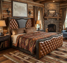 Indulge in the ultimate blend of rustic elegance and refined comfort with this stunning tufted leather bed. Crafted with hand-tufted Mont Blanc Caramel leather that invites you to sink into luxury, it's complemented by distinctive Gator Hornback Rustic Walnut accents that deliver authentic Western character. The complete package includes a supportive slatted base, upholstered rails, matching headboard, and footboard—everything you need for a bedroom transformation. Whether your home is a sprawling ranch, mountain retreat, cozy cabin, or modern farmhouse, this bed becomes an instant focal point that whispers sophistication while promising nights of unparalleled rest. More than furniture, it's an investment in the lifestyle you deserve.