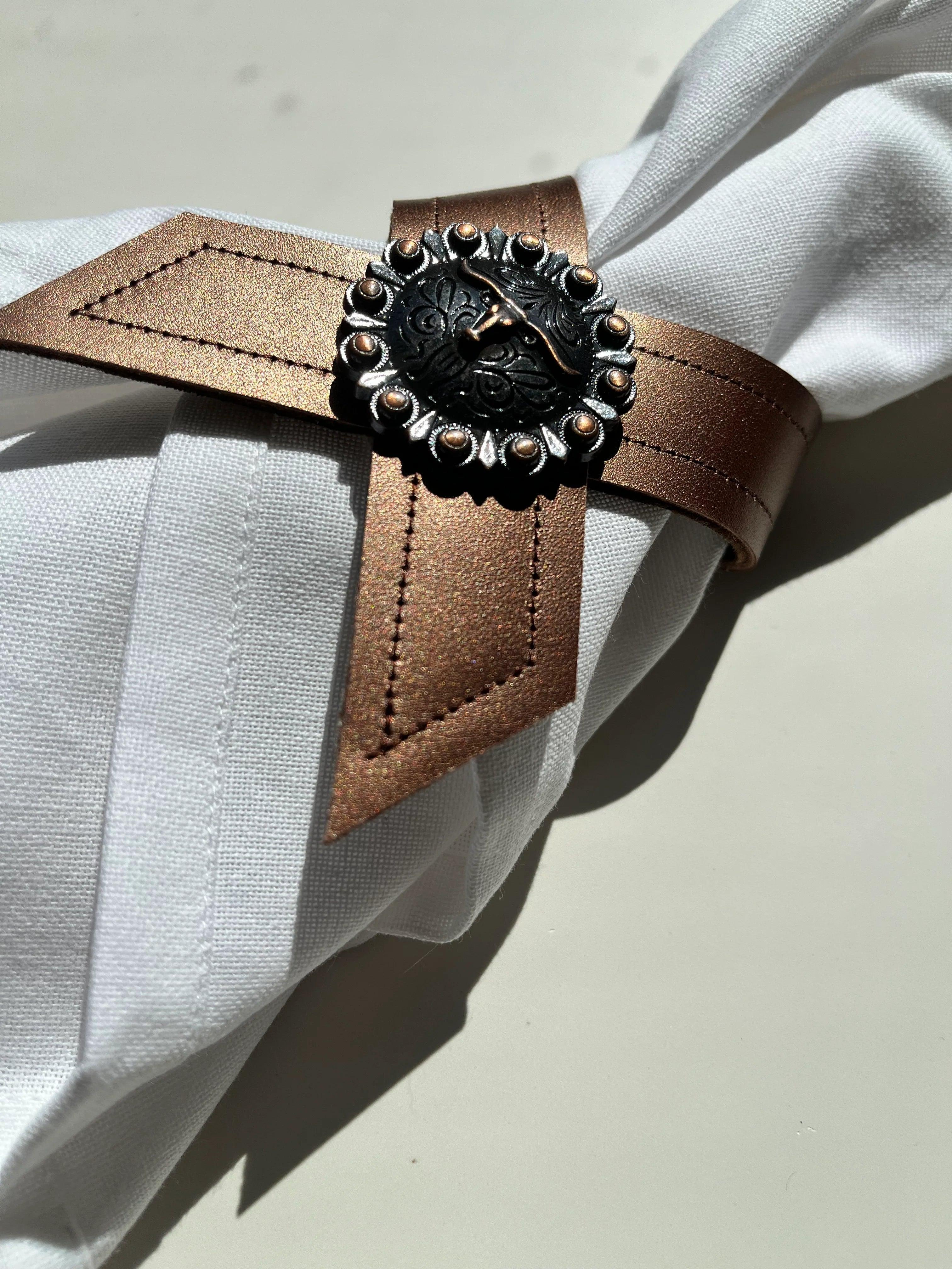 Crafted with genuine metallic brown leather and faux leather backs, our Concho & Leather Napkin Rings bring a truly unique western vibe to your table setting. The metal conchos will add eye-catching depth to your decor!