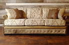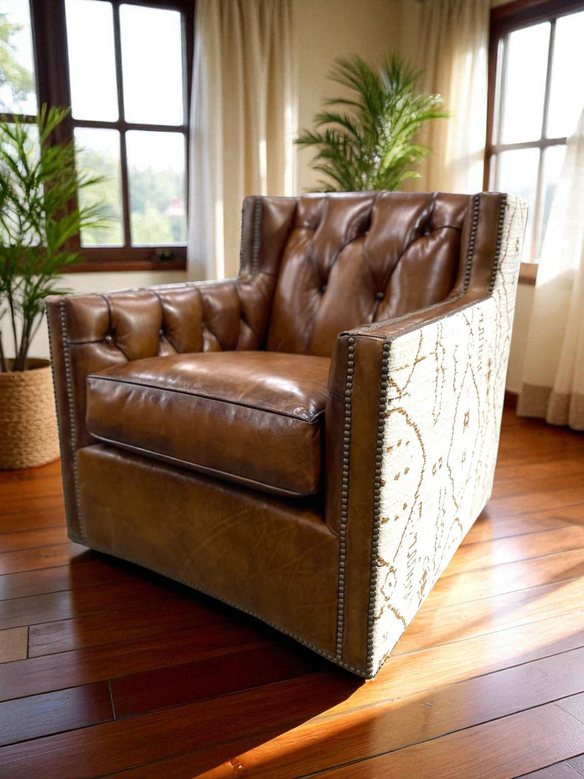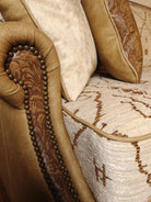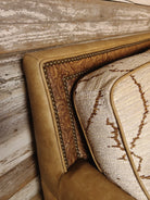 Elevate your living room with the Mesa & Leather Sofa, blending rustic southwestern charm with refined luxury. Designed with light brindle hair-on-hide, supple Longhorn Oatmeal base leather, floral brown sugar embossed leather, brass nail accents, and distinctive southwest Mesa-patterned fabric, this sofa brings warmth and sophistication to any rustic home or lodge setting.
