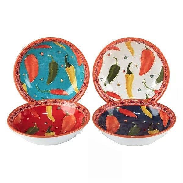 The Mexican Fiesta Dinnerware Collection includes pieces decorated with all different colors and patterns of peppers and cactus.