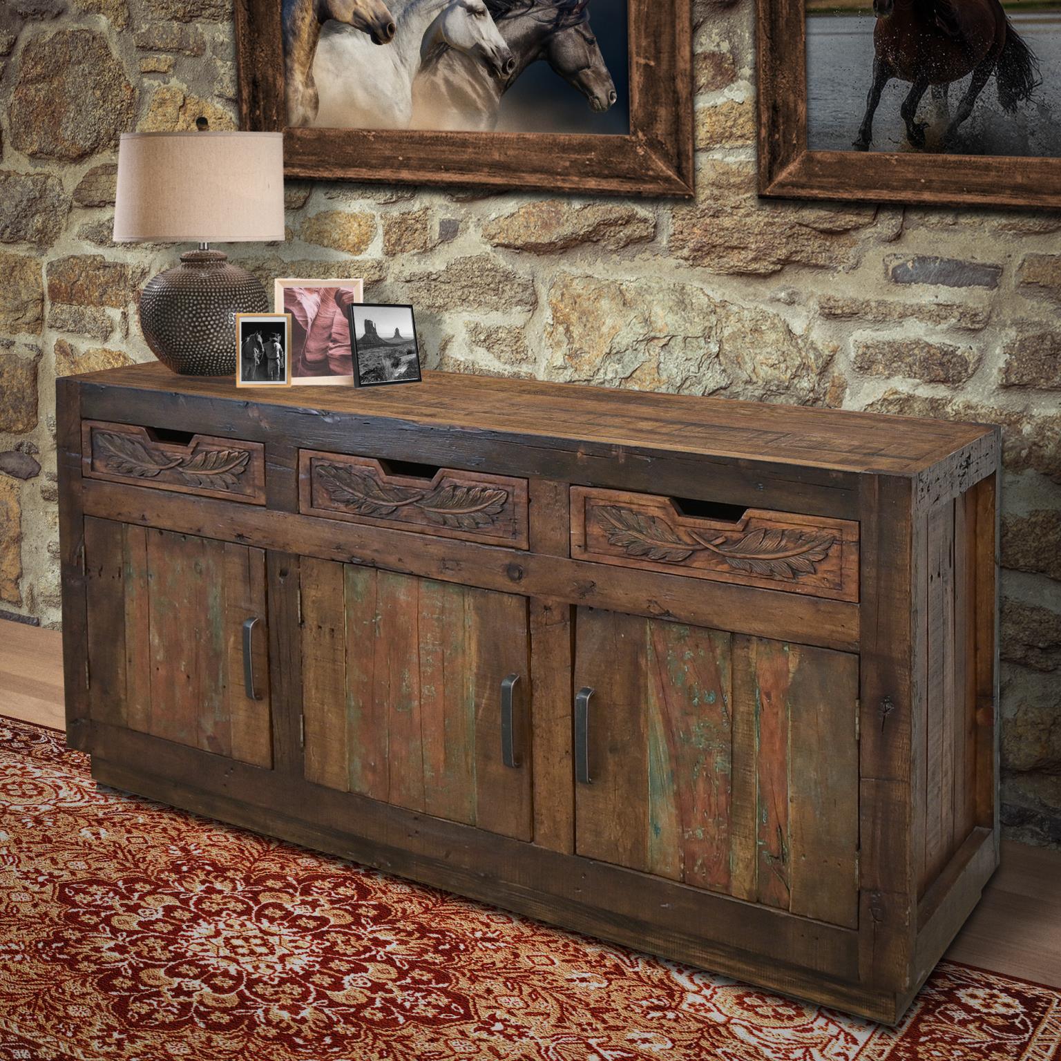 Experience the charm and character of our Montana Sideboard, crafted with intricate attention to detail. Its reclaimed wood door design and hand carved drawers create a rustic, timeless look. This versatile accent piece elevates any space, from the entryway to the dining or living room.