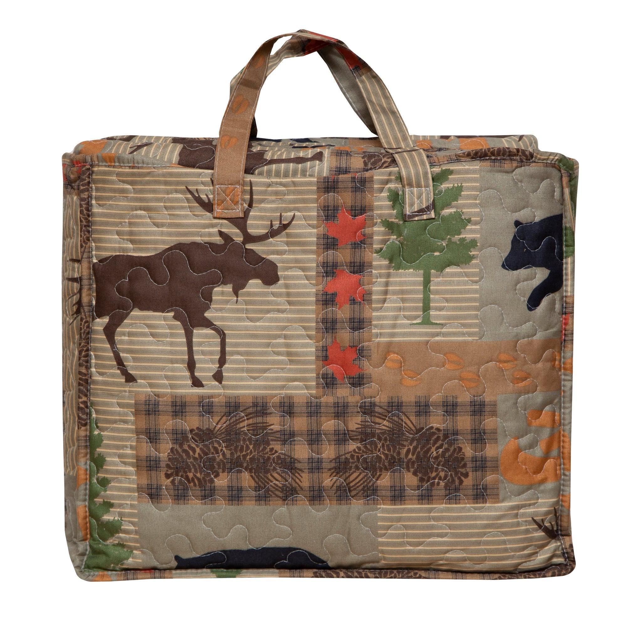 Our Ontario Wilderness Lodge Quilt Set features images of roaming bear and moose mixed with pine cones, trees and leaves over a beige and green background.