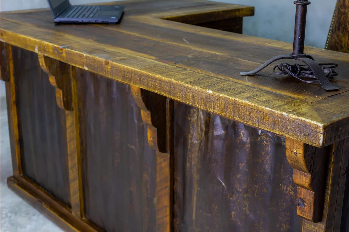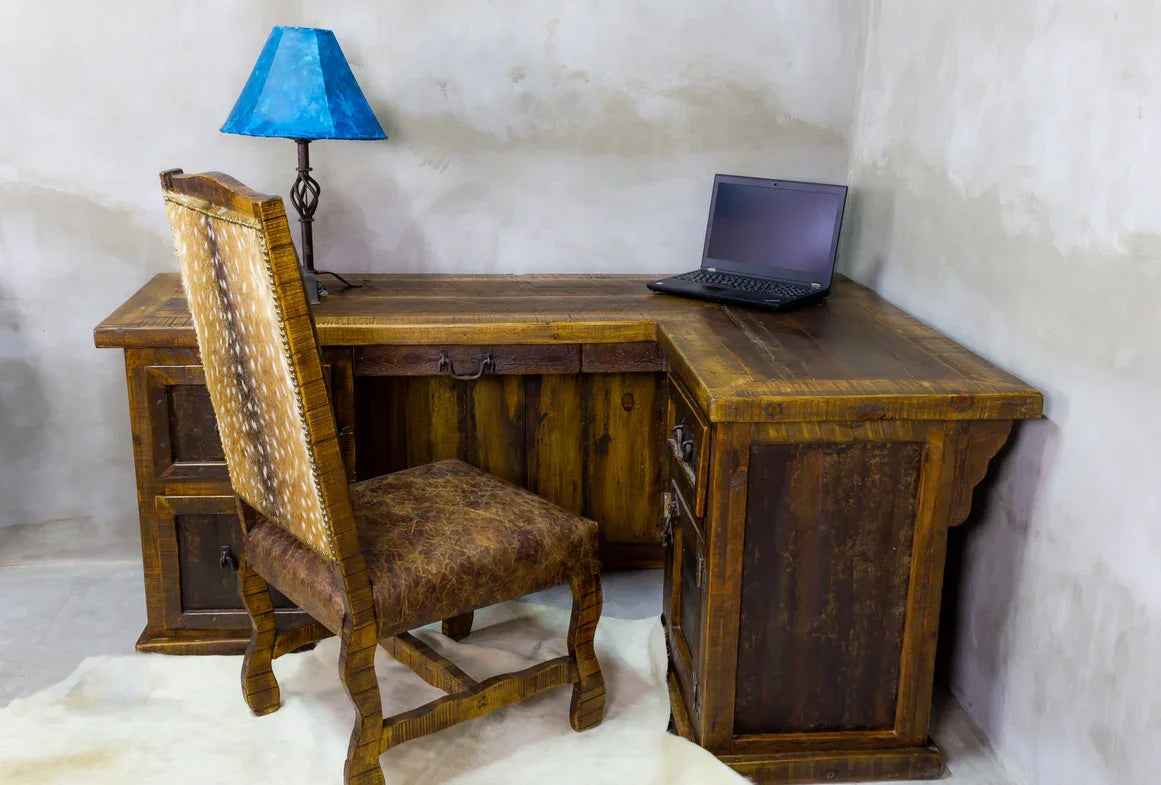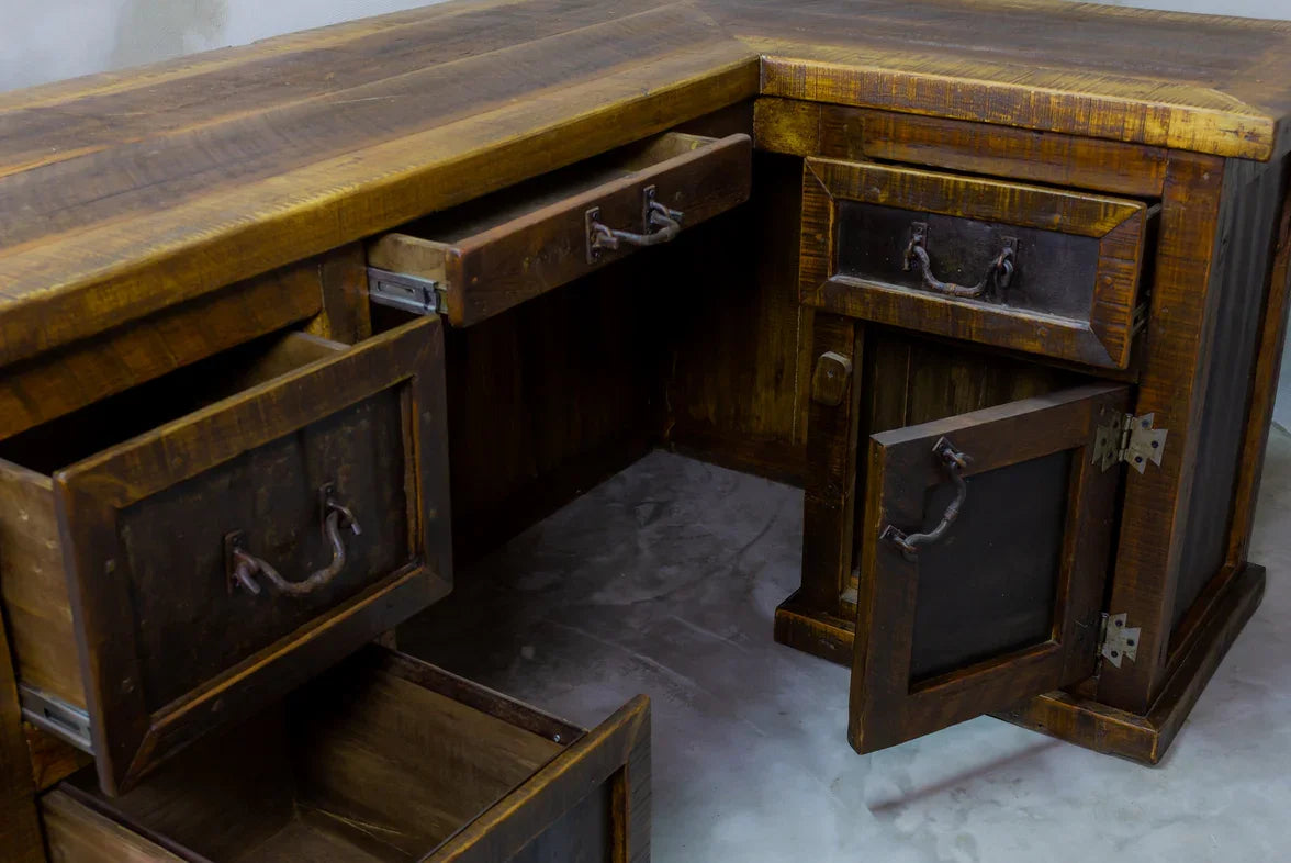 Reimagine your workspace with our Pueblo Rustic Corner L-Desk. This work of art is not just a desk, but a bold declaration of style and functionality. The distressed panels radiate charm, and the L-shaped layout maximizes productivity while the 4 drawers and innovative cabinet-style compartment provide convenient organization. Elevate your workspace now with this exceptional rustic desk.