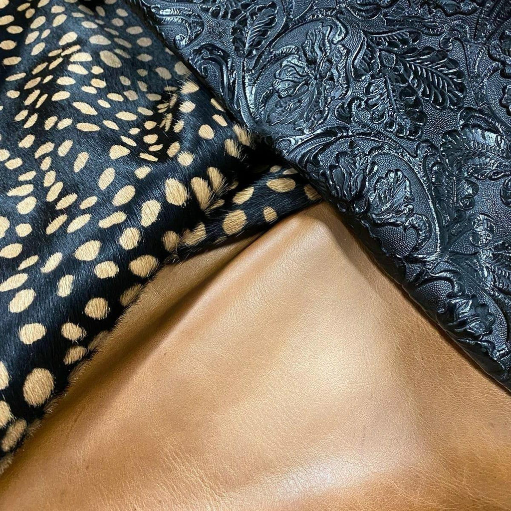 The Cheetah on Reverse Black/Beige Stenciled Cowhide is sold for your upholstery needs. This hide is sold in full hides & measure approximately 35-40 sq ft.