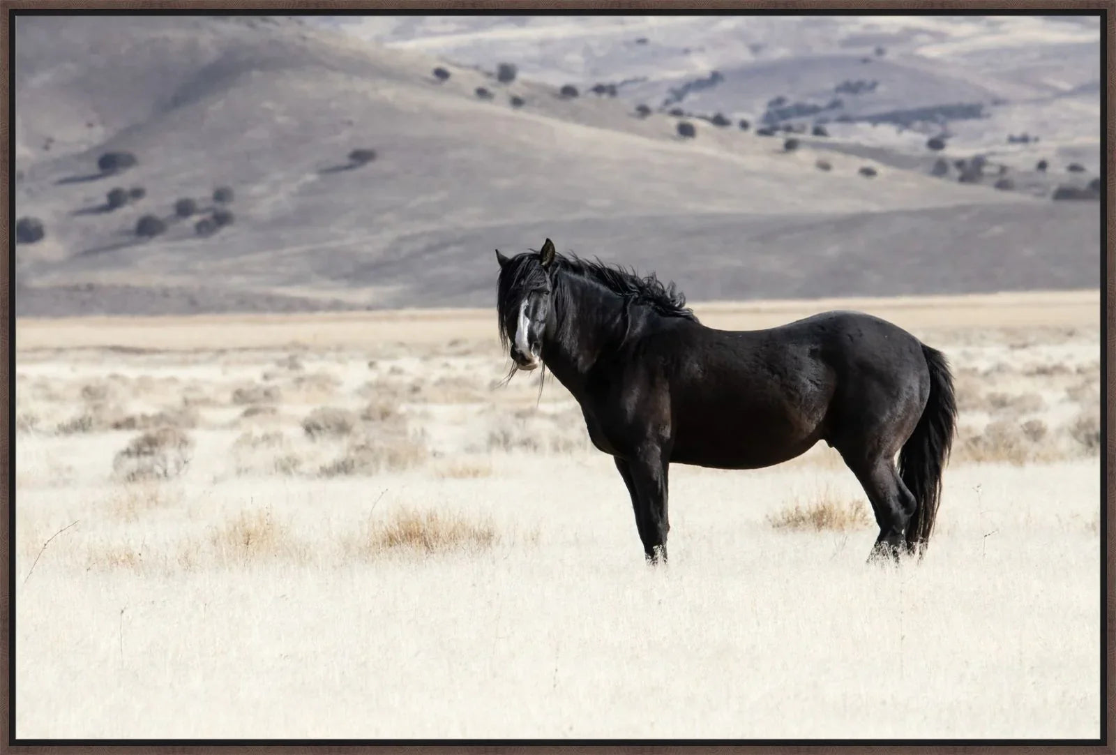 Expertly crafted and framed in matte black, Royal Black - Framed Horse Art is a must-have for any interior design. With its horizontal orientation, this piece adds a touch of sophistication and emotional resonance to any space, making it the perfect focal point for a living room, bedroom, or office. Whether in a desert ranch or modern home, this horse art is sure to captivate with its understated charm.
