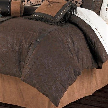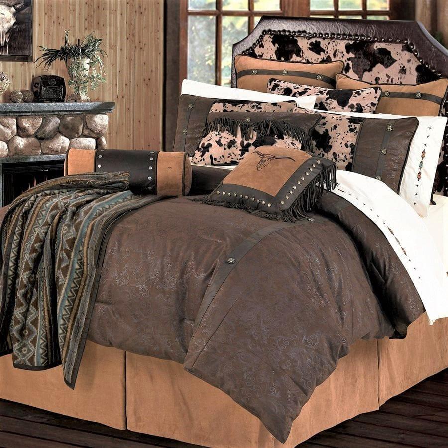 Stately conchos, metal studs, and faux leather fringes add the finishing touches for a sophisticated western bedding ensemble.