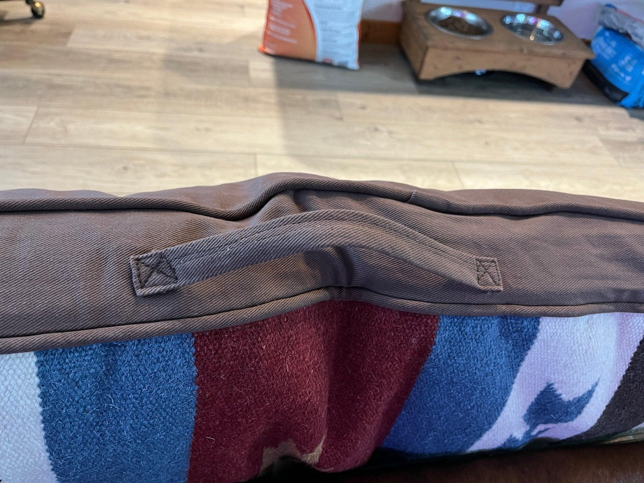Dog beds are made by hand with a soft canvas backing and a cozy yet tough flat woven wool top. The inserts are removable making cleaning the beds easy. We recommend a cold wash and an air dry. For quick fixes a simple once over with the vacuum will suffice.