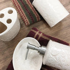 Spice up your bathroom with this colorful 9 Piece Serape Stripe Bath Collection. This collection features hues of turquoise, burgundy, sunset orange and chocolate perfect for your southwest inspired bathroom. The Serape lifestyle bathroom set includes striped shower curtain w/ fabric covered rings, 3-piece cactus bath towel set in cream, arrows bath rug, and 4-piece Savannah bath countertop accessory set in cream. Items featured in our collections can be purchased separately.