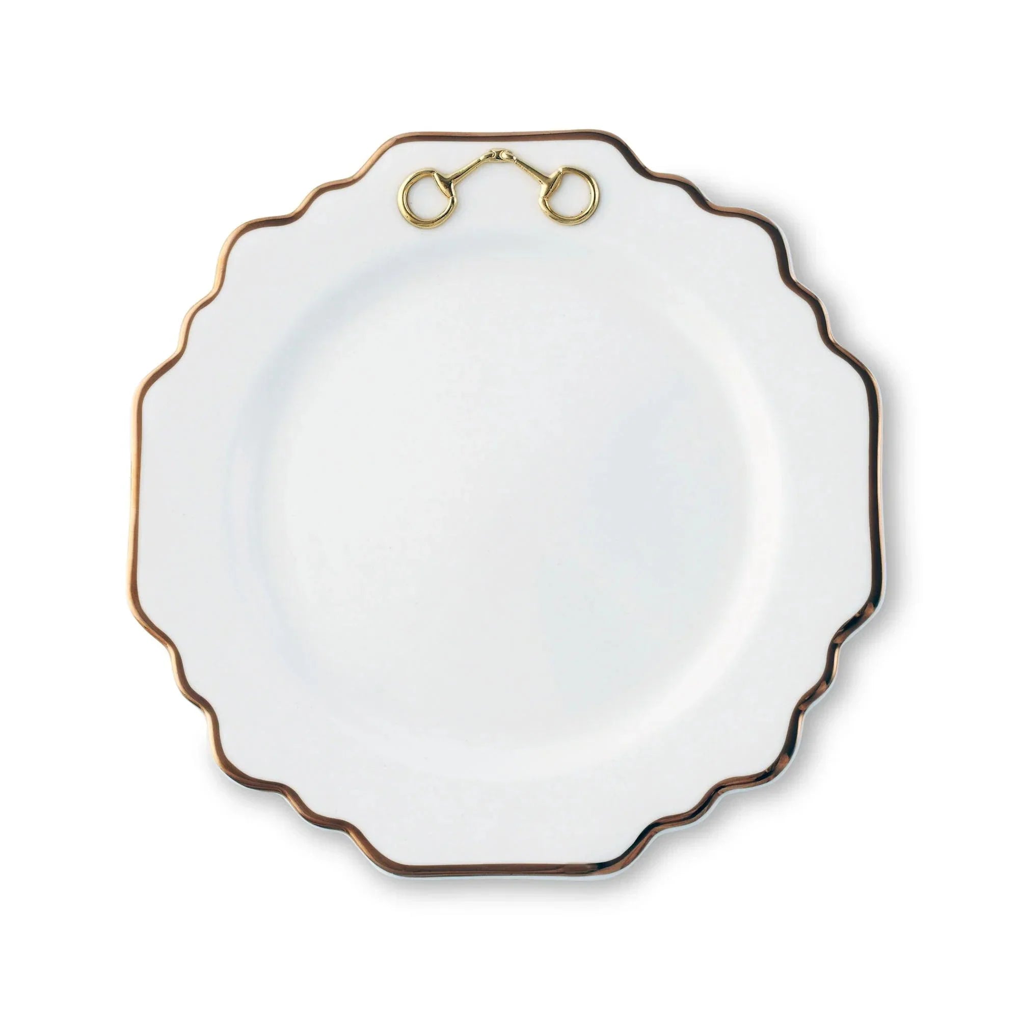 Experience effortless equestrian elegance at your dinner gathering with our Snaffle Bit Gold Scallop Salad Plates. Crafted with an intricate and classic snaffle bit design, these salad plates are the perfect way to liven up your celebration. Sophisticated and timeless, these plates are sure to make a unique statement with the scallop design. Crafted from bone china with a distinctive hand made gold rim & pewter snaffle bit.