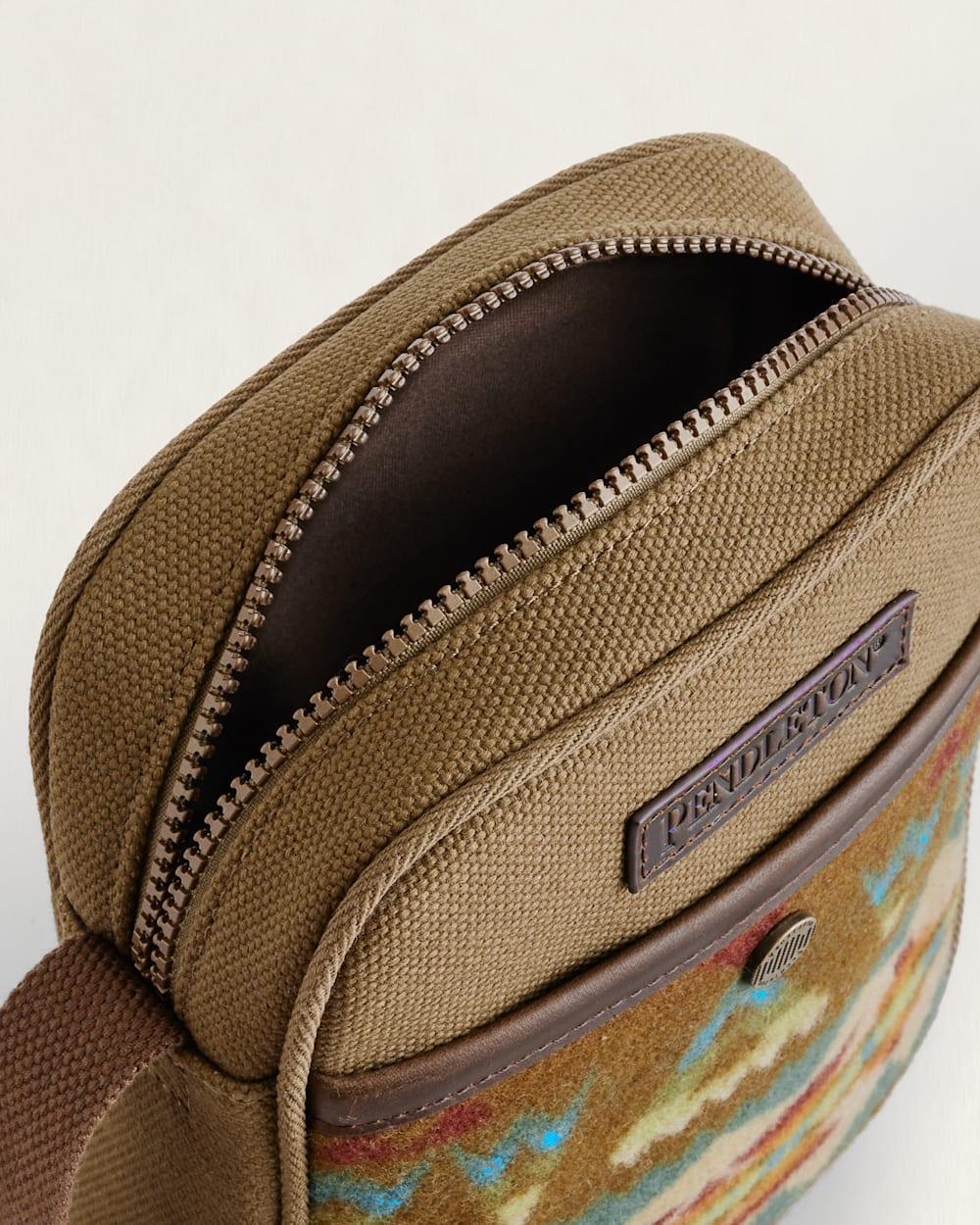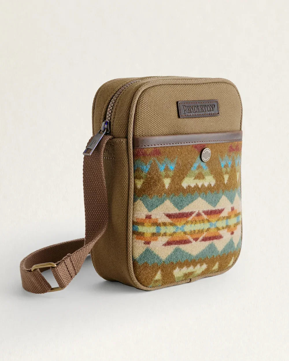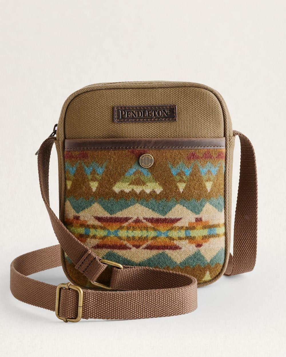 This stunning crossbody bag boasts a spacious interior and a large front pocket with a zip closure crafted from high-quality USA wool. Its chic cotton canvas material and classic leather logo patch add to its stylish appeal. Each bag is unique, with varying patterns for added character.