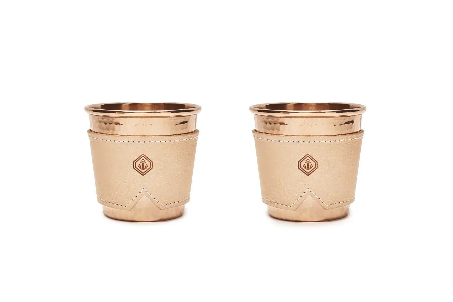 This set of two 12 oz. copper mugs with leather sleeves. Hand-hammered solid 100% recycled copper cups are accessorized with removable stitched leather sleeves that insulate hands from hot or cold. Available in natural, black, and Indigo.
