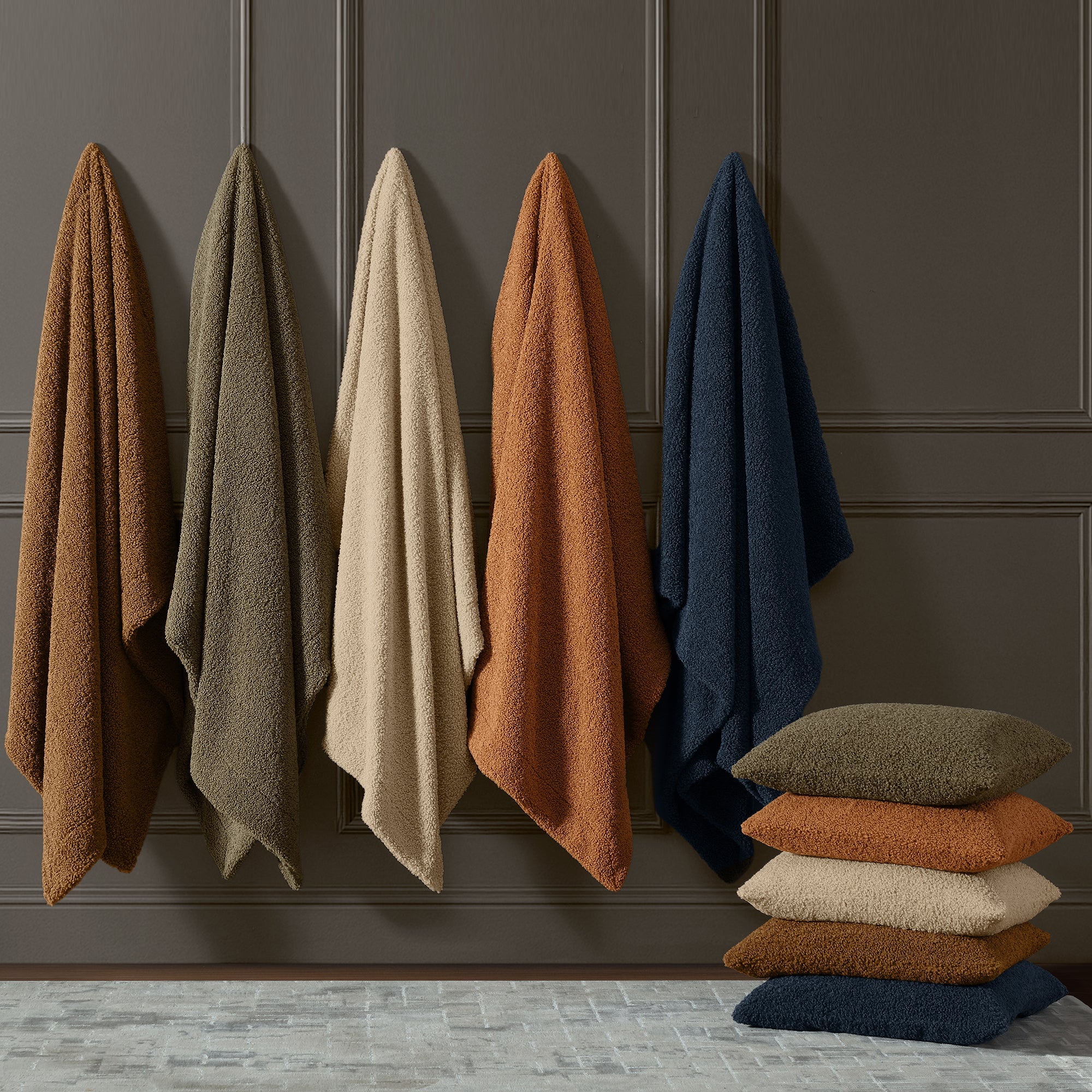 Sink into pure indulgence with our Teddy Throw Blanket, where premium woven boucle pile meets everyday luxury. The signature curled loops deliver an exceptionally plush surface that feels as good as it looks. Select from two versatile sizes—a compact throw for accent layering or a spacious blanket for full-bed coverage and oversized furniture. Six carefully curated hues span from warm neutrals like cream, caramel, umber, and dark oak to the refined elegance of midnight blue, ensuring seamless coordination with any décor style. Built to last, these resilient fibers maintain their signature softness through countless uses, making this the perfect foundation for mixing with patterned accents or classic textures.