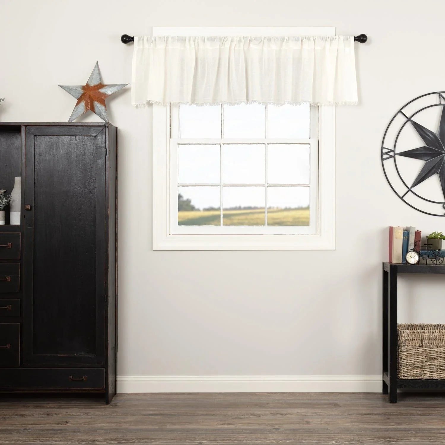 The Tobacco Cloth Antique White Valance w/ Fringe brings a luxuriously upscale farmhouse look to your home or retreat.
