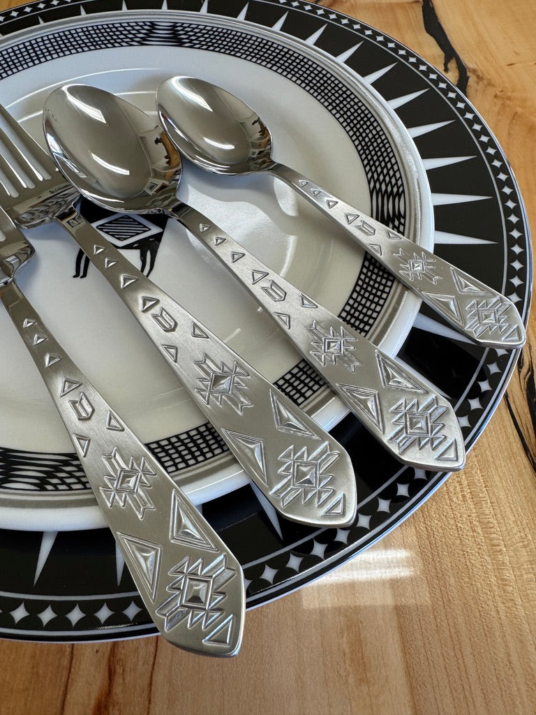 Bring authentic southwestern flair to your dining experience with the Pueblo Flatware Set. Crafted from durable 18/0 stainless steel, this striking collection withstands daily use while delivering bold, dramatic style inspired by desert traditions. Each piece showcases distinctive southwestern design that transforms an ordinary table into a conversation-starting showcase. Perfect for those who appreciate rustic elegance with a modern edge, this flatware set combines lasting quality with unmistakable character that elevates every meal.