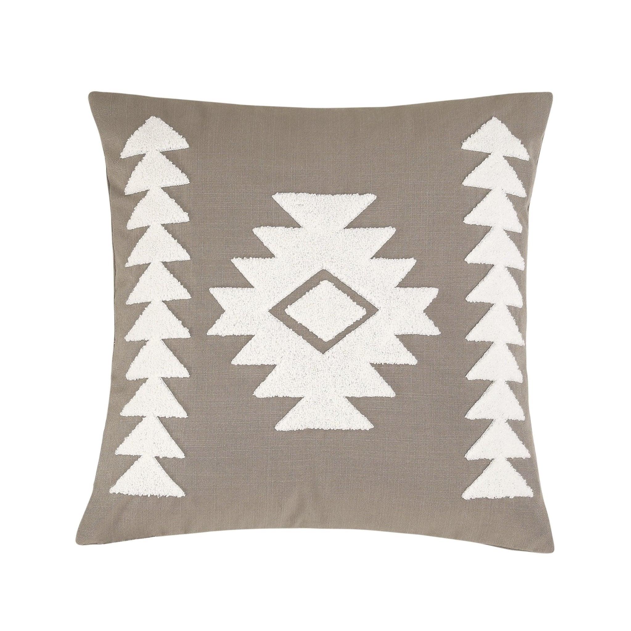 The Aztec design with arrow details in soft cream crewel embroidery and neutral ground of taupe pair well with the Applique Arrow Design pillow or the Trent pillow.