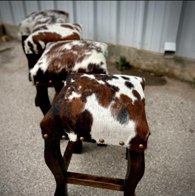 Bring authentic western charm to your space with these handcrafted Tri Color Cowhide Bar Stools. Each piece features premium cowhide upholstery in striking tri-color patterns that instantly transforms any room into a rustic retreat. Select from four distinctive frame finishes and four comfortable seat heights to perfectly match your décor and needs. Customize the upholstery to suit your vision. Proudly made in America, these stools combine quality craftsmanship with timeless western style that makes a bold statement.