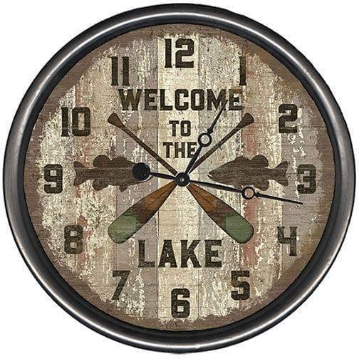 Our Vintage "Welcome to the Lake" Wall Clock features a vintage design of fish and oars printed directly onto the wood.