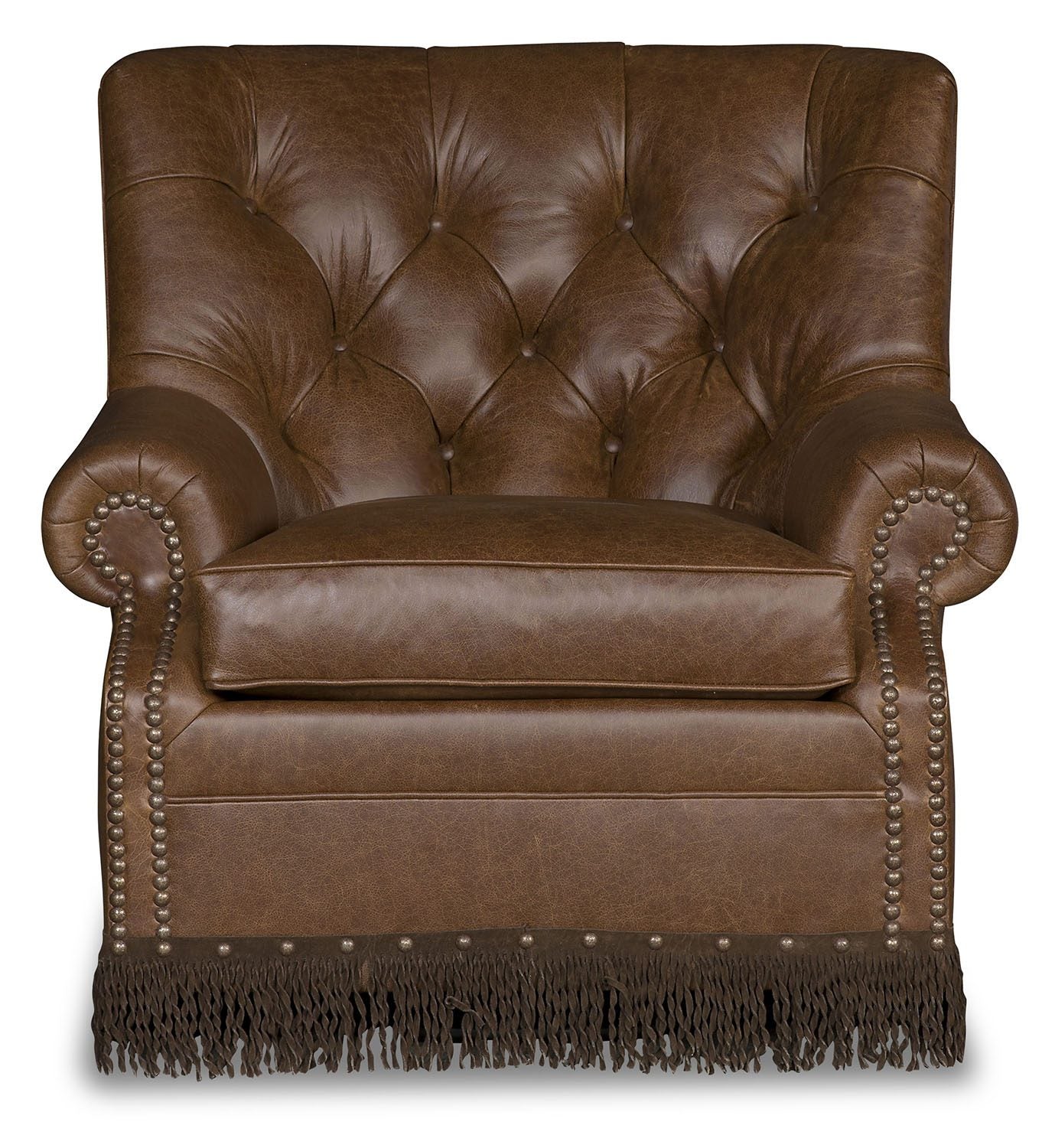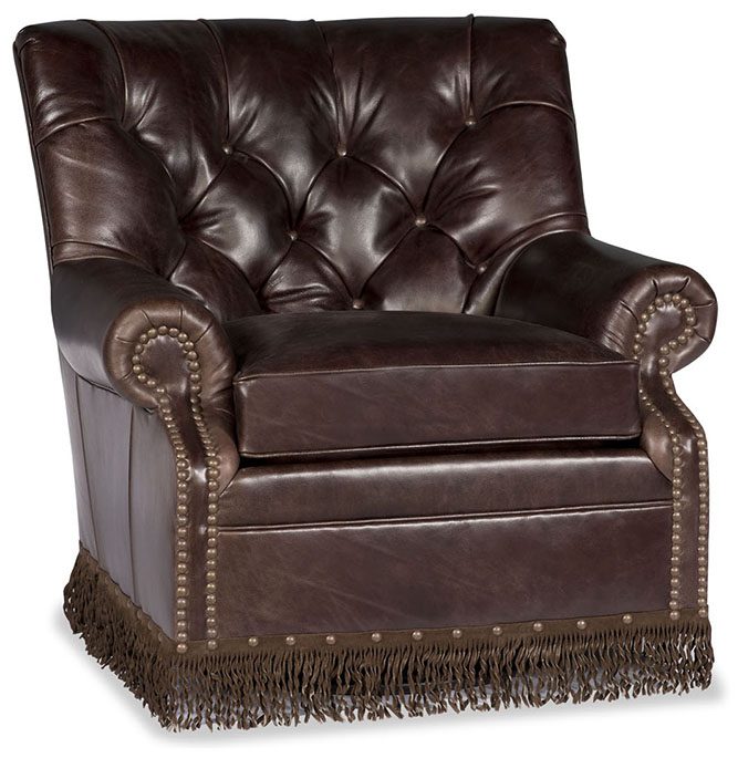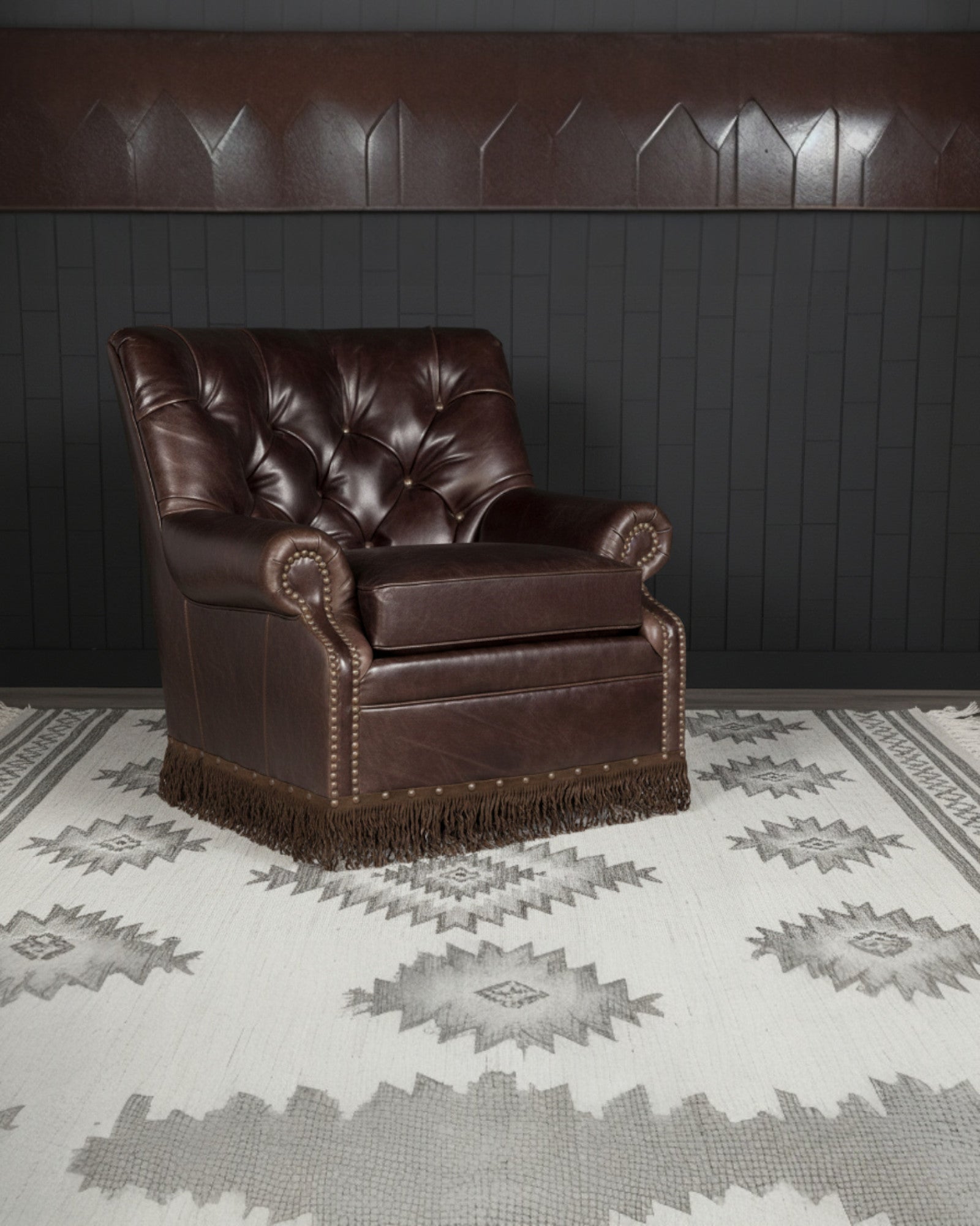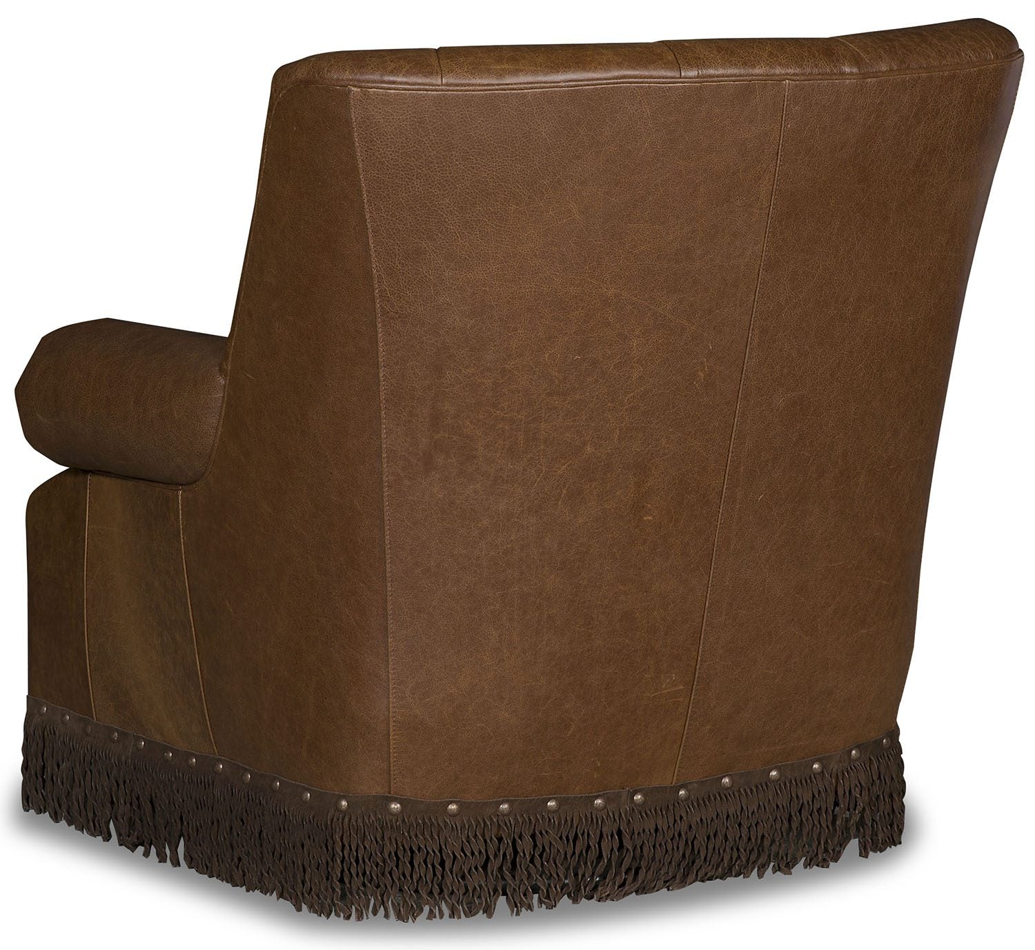 The tufted back, spring-down seat cushion, accent nailhead trim, and twisted leather fringe add rich western detail while maintaining an elegant, upscale aesthetic. A smooth 360-degree swivel and gliding motion allows for effortless movement, making this chair ideal for relaxing, reading, or casual seating in a living room, office, or lodge-style space.