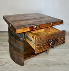 Bring in rustic charm with our Whiskey Barrel Base End Table. This rustic end table will be a one-of-a-kind addition to your living room or sitting area! Handcrafted from authentic tequila barrels, it features a lower shelf perfect for storing books, decor, or bottles, and a drawer for remotes, books, etc!
