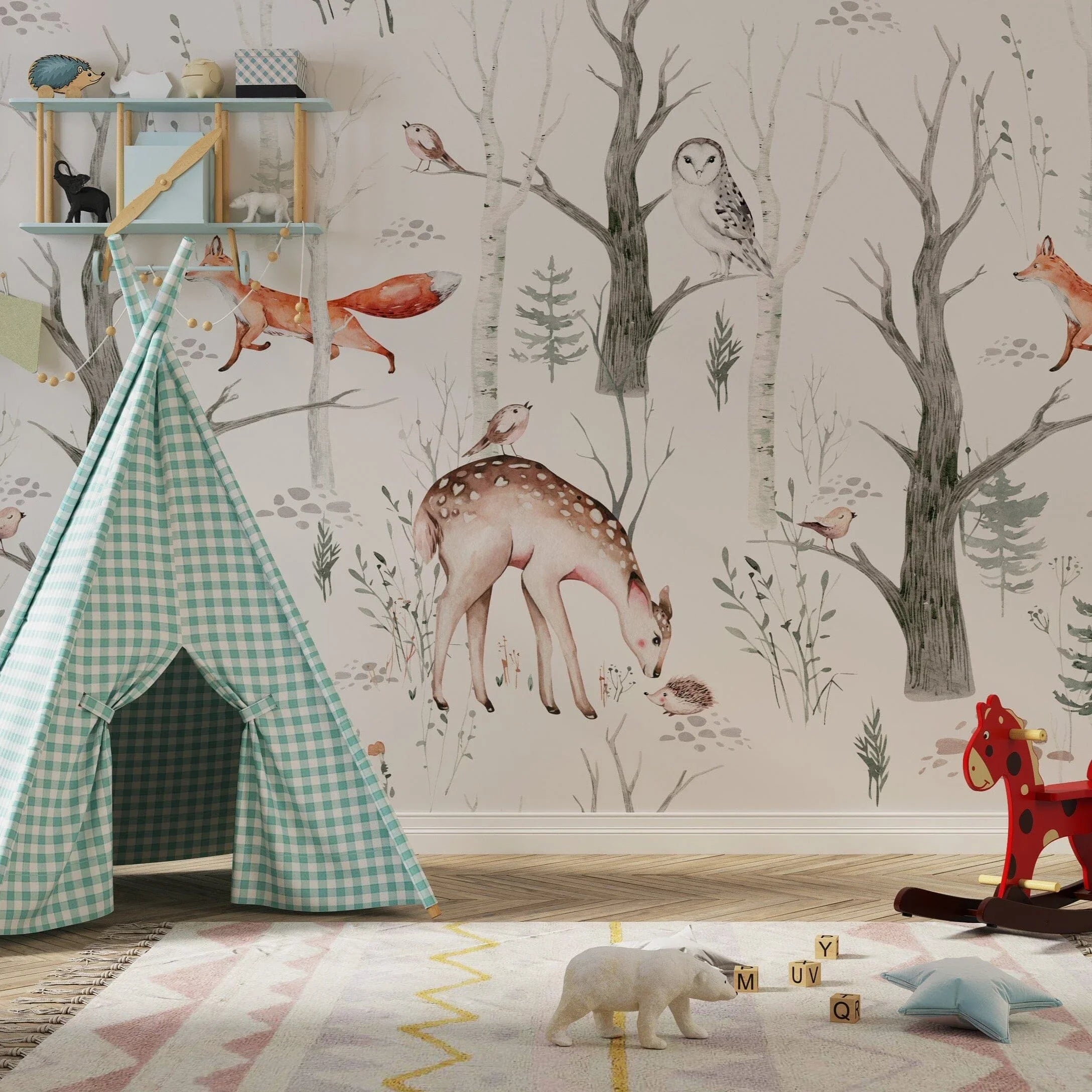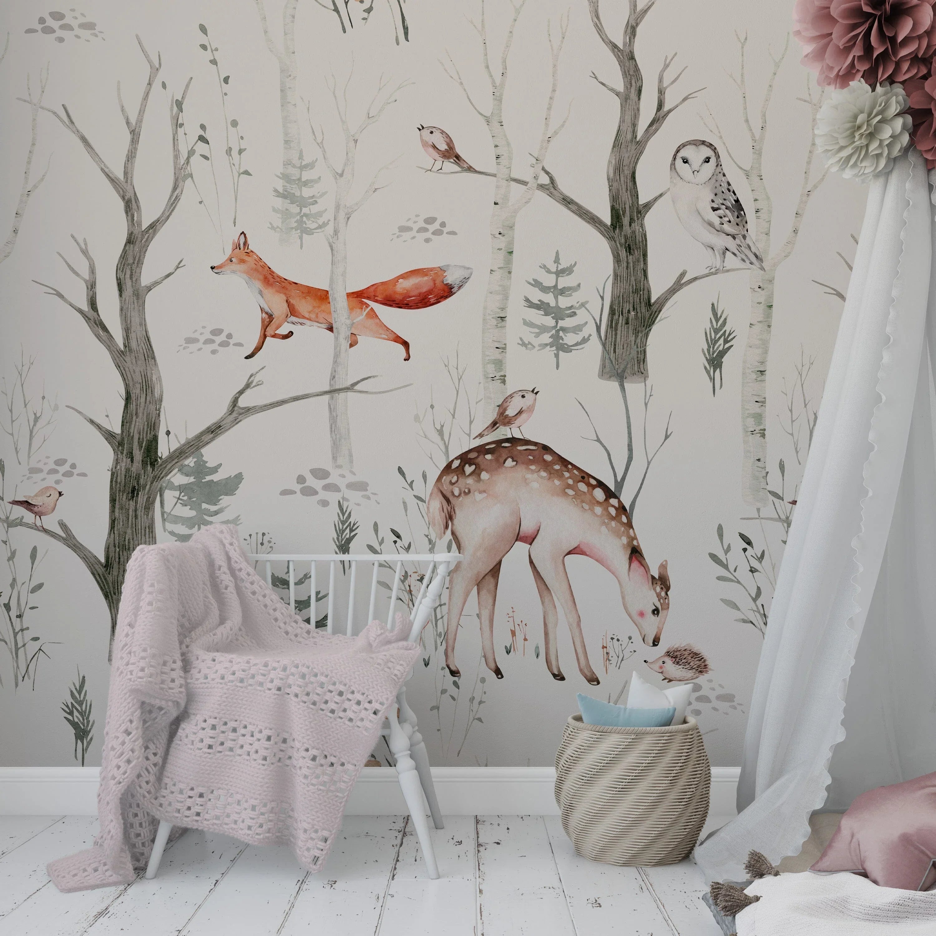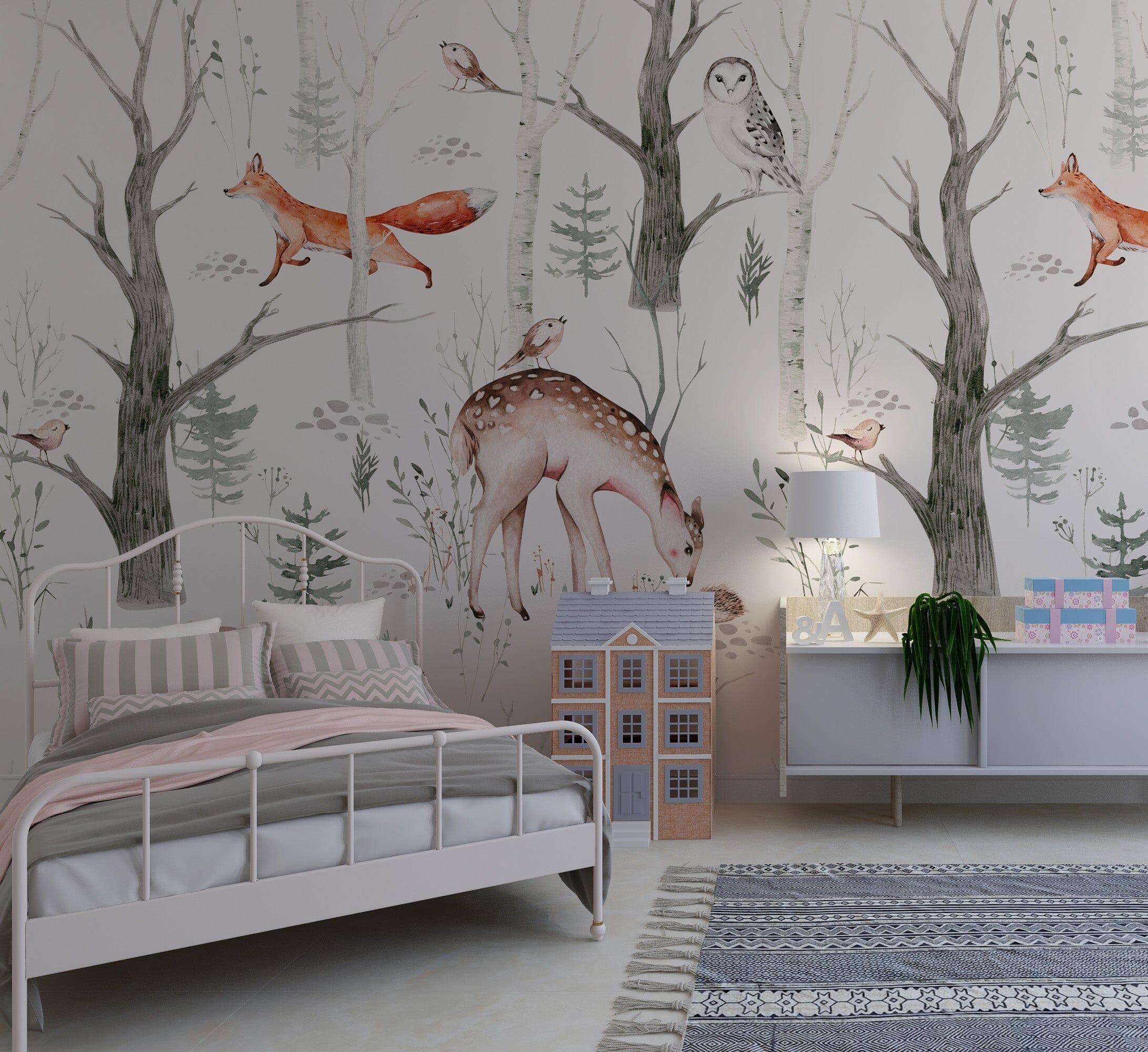 This Woodland Creatures Wallpaper is both visually pleasing and functional for modern parenting. Whether you are designing a nursery with a theme or seeking subtle, whimsical wall decor, our Woodland Wallpaper Nursery option is an ideal selection.