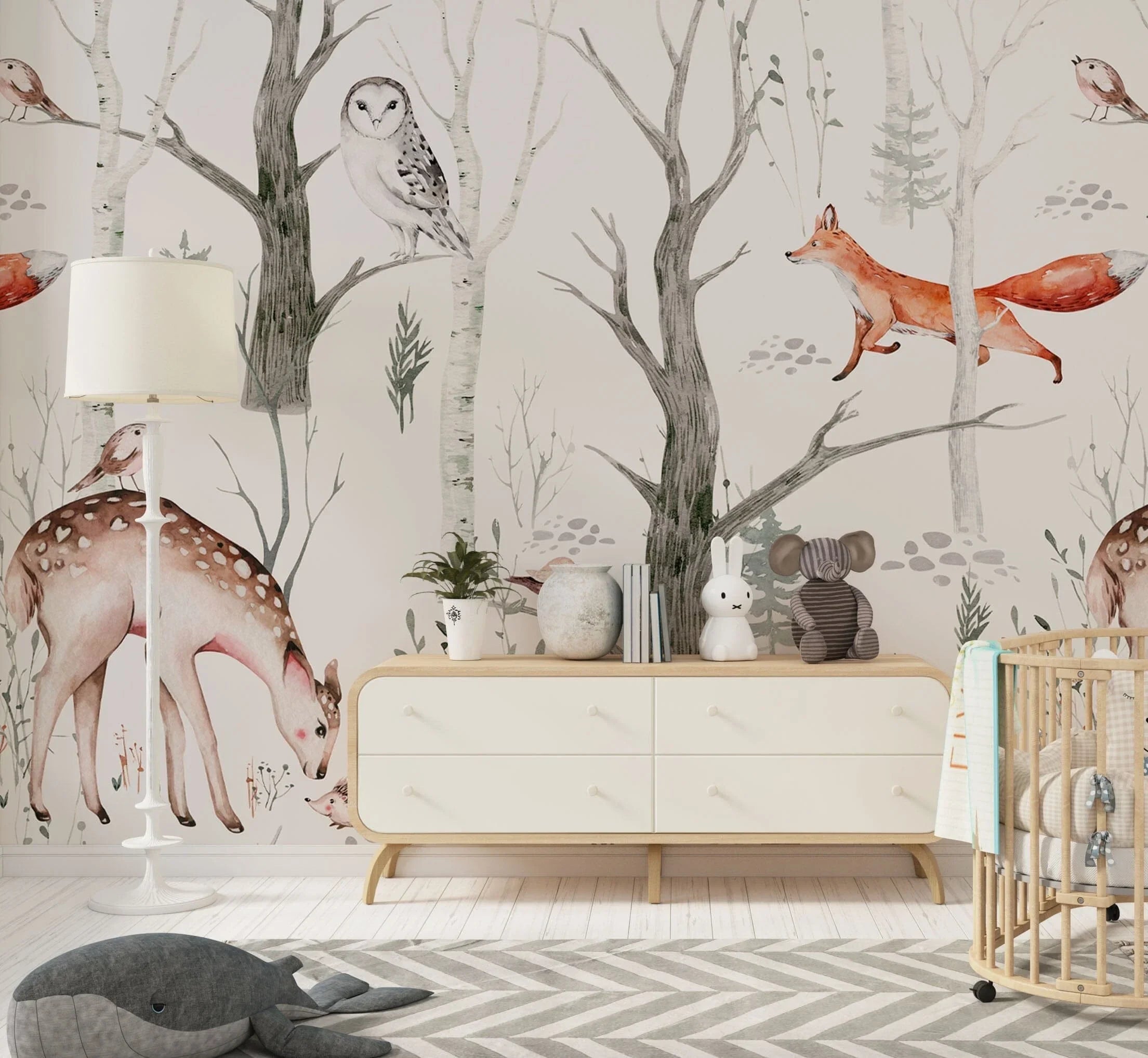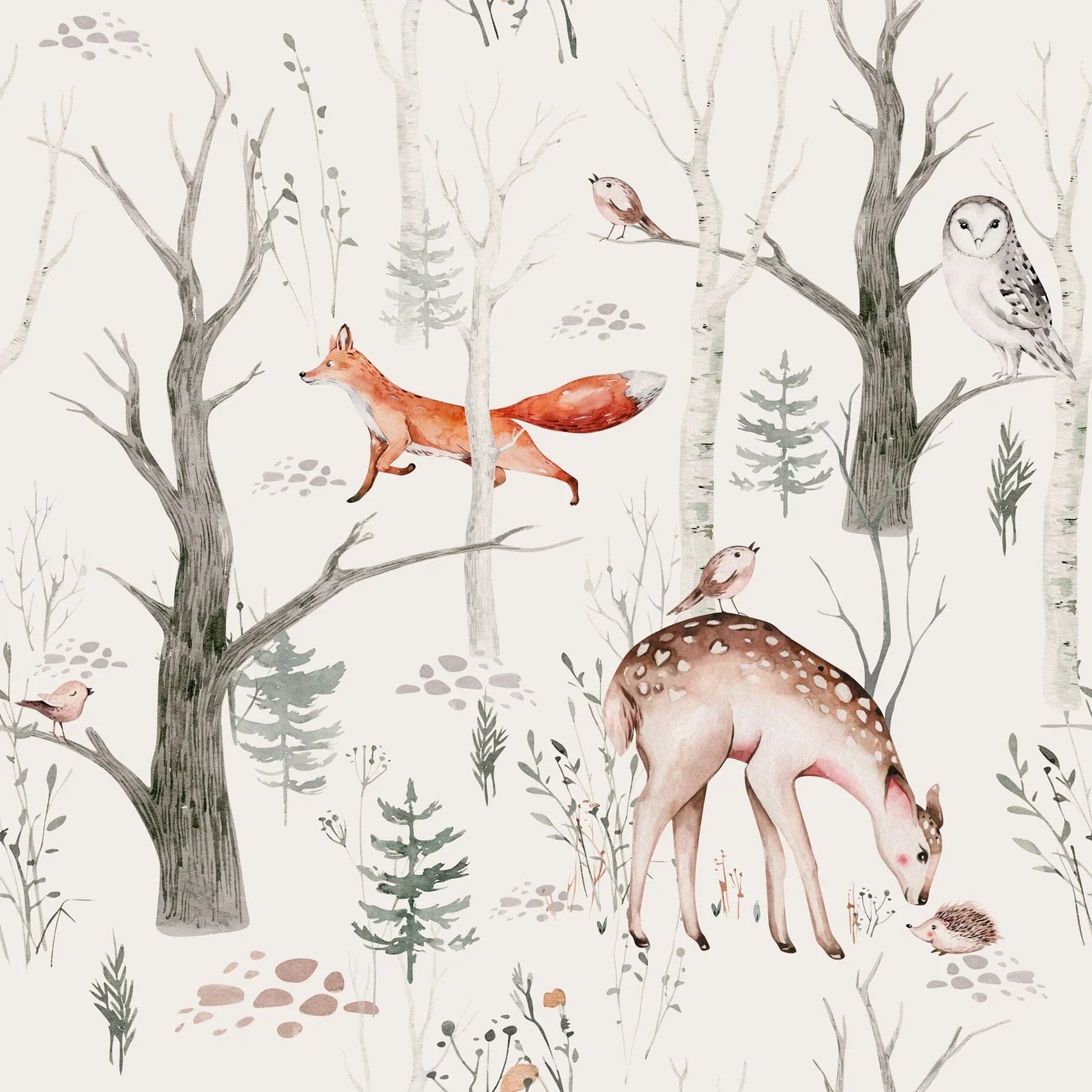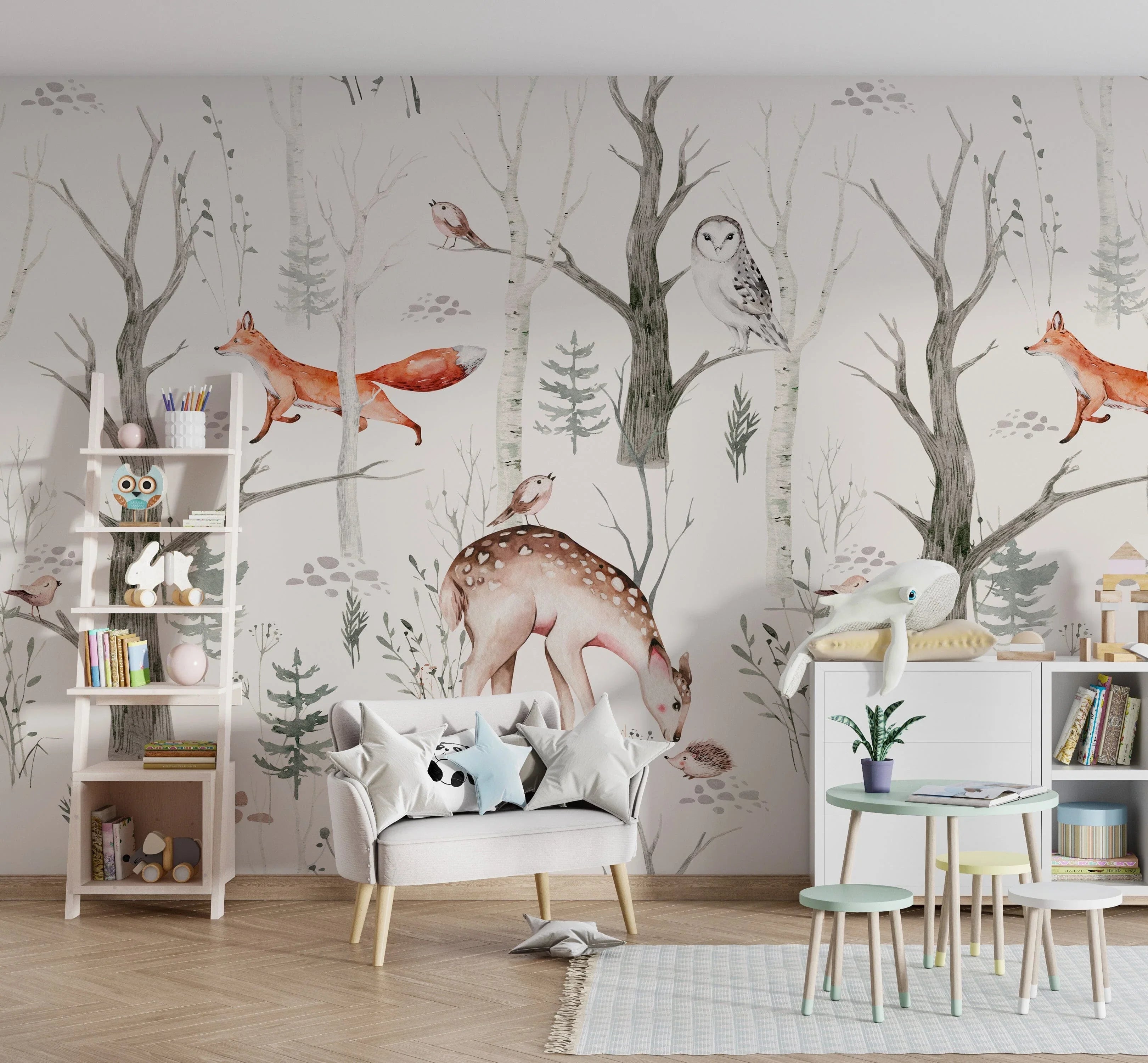 This Woodland Creatures Wallpaper is both visually pleasing and functional for modern parenting. Whether you are designing a nursery with a theme or seeking subtle, whimsical wall decor, our Woodland Wallpaper Nursery option is an ideal selection.